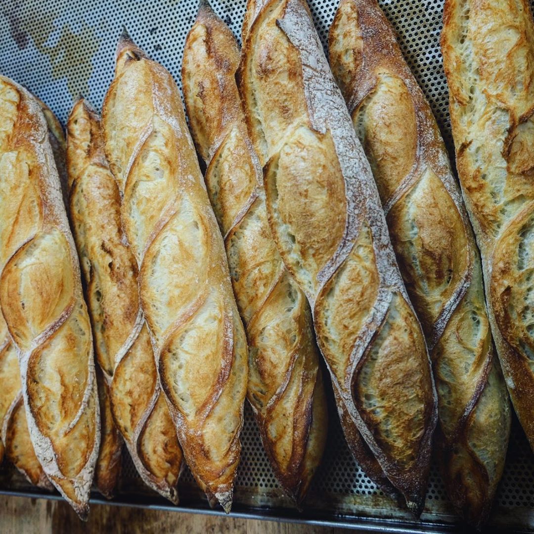 Unser Dinkelbaguette besteht zu 100% aus Bio-Dinkelmehl vom Gut Rosenkrantz aus Schleswig-Holstein. Es bekommt eine extra lange Teigruhe von 24h und wird dann bei 270°C in unserem Heuft-Tuffstein Backofen gebacken.